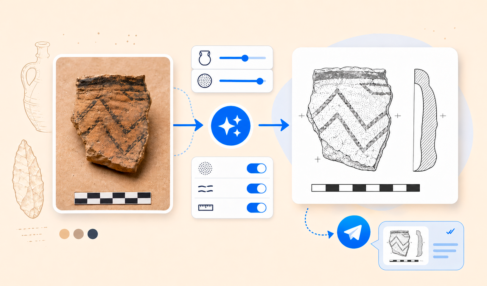 ZROK превращает фотографии артефактов и археологических контекстов в чистые, точные и готовые к публикации научные изображения.